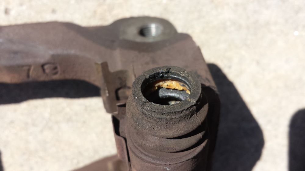 再来看看前刹系统的情况,觉得整个系统良好,rotor表面光滑无磨痕,厚度均匀。pads厚度还剩下3/4左右,指示槽还在。hub和rotor之间没有锈没有粘得很紧。唯一觉得可能有问题的是slide pin和rubber boots,pin不能自由的滑动,boots里面干枯无润滑剂,但见里面有干裂的黄色grease样的东西,估计是上次换rotor时修车铺放进去的,感觉已无润滑功能。