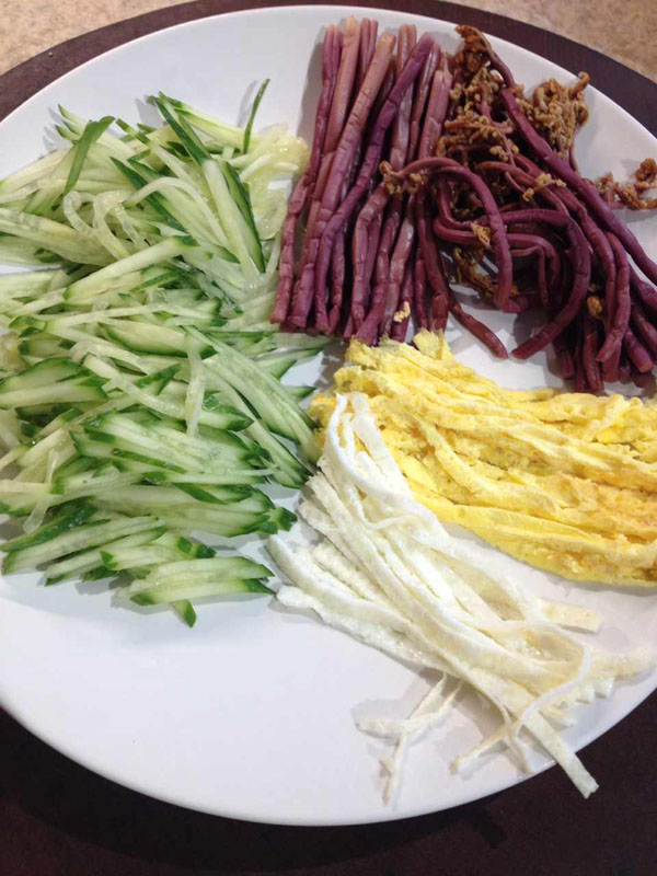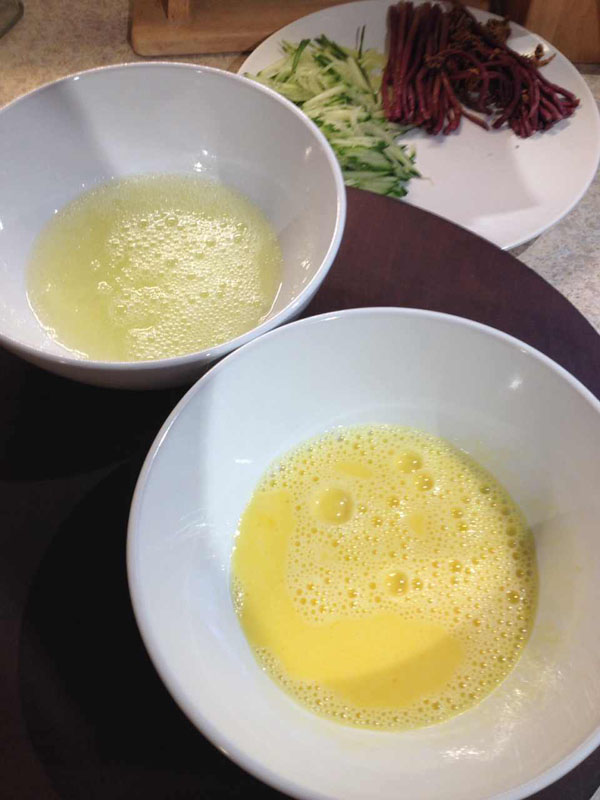 两个鸡蛋分开蛋黄和蛋清,摊成薄饼然后切丝。紫红色的是买的袋装水煮蕨菜