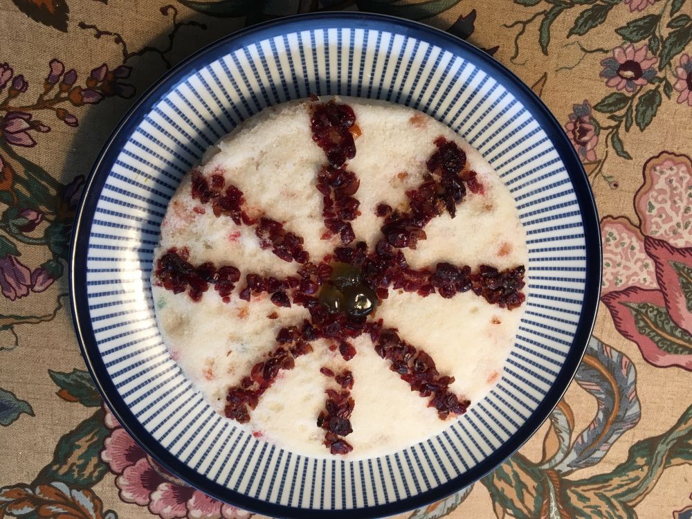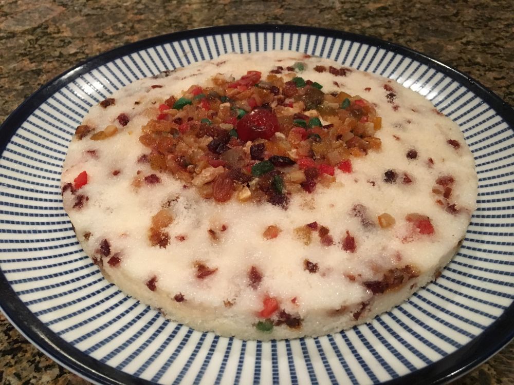 用1/4杯的蜜饯铺在松糕上做装饰。