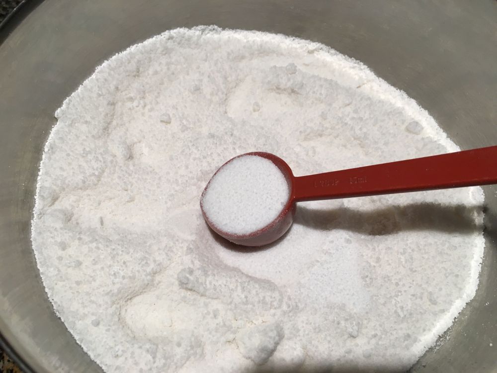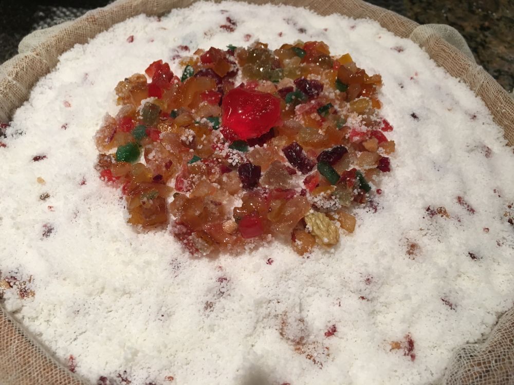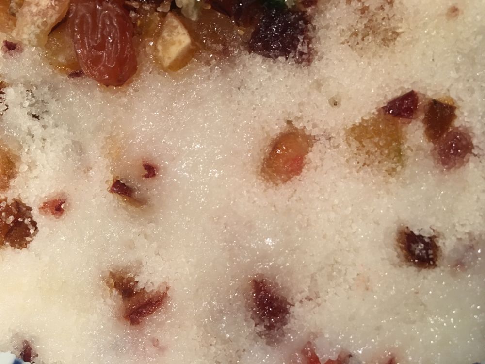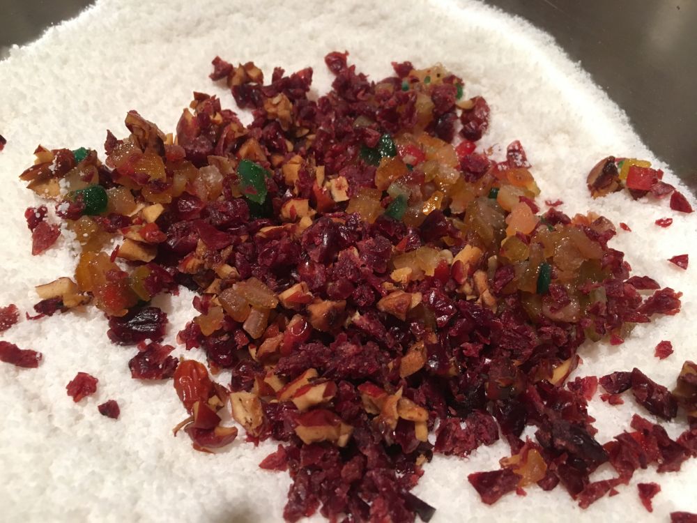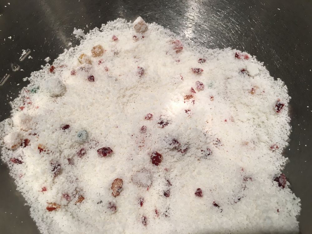 混合红枣,蔓越莓干和一半蜜饯在筛过的米粉里。