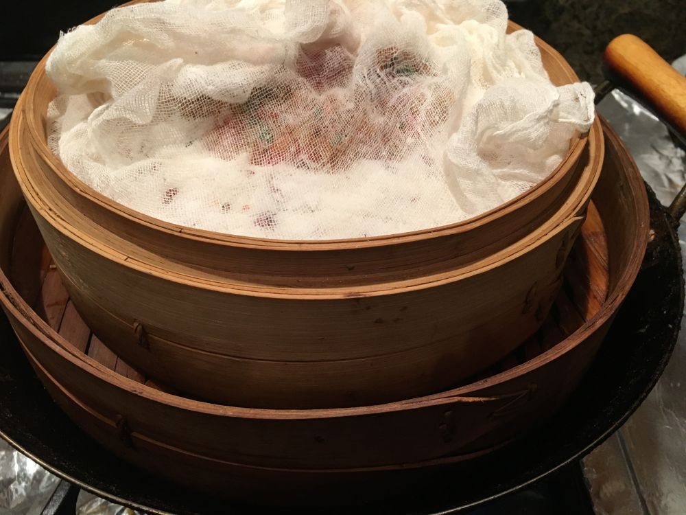 盖上锅盖,大火转中火蒸30-45分钟, 如同蒸糯米饭一样蒸。