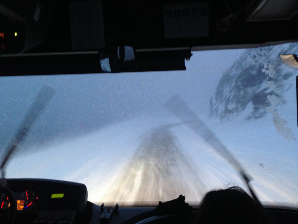 天气 开始变得更糟,等了近一小时让铲雪车清理山路后,再车队下山。坐在第一辆巴士的第一排,眼看几米前面的扫雪车时隐时现,有时全白中只见桔色立杆才勉强认 路,其实旁边就是落海的山崖。几十分钟紧张地看司机左拐又转,终于回到港口,感觉坐了趟过山车,北极风雪过山车。