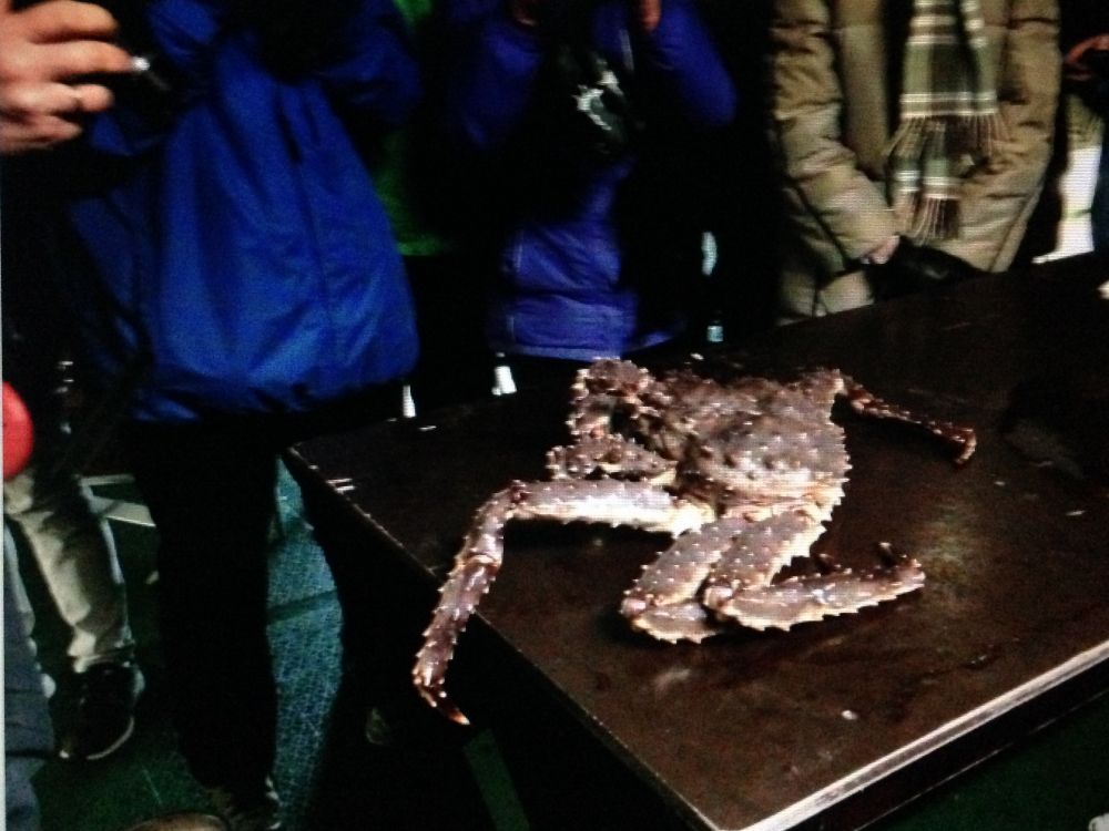 今天是中国大年夜。船上也不提供一点中餐,比如饺子年糕什么的,我仅有几包泡面不合适当年夜饭。今晚也是终点前船上最后一晚,海鲜自助餐,包括挪威帝王蟹 脚,另外驯鹿肉。傍晚时当地渔民特地搬上新捞生猛大蟹给游客看,拎着脚两尺多长够重的。那么我只好随俗海鲜大蟹来将就啦。以后指望更多中国游客,就可以改 变世界,任性一下。