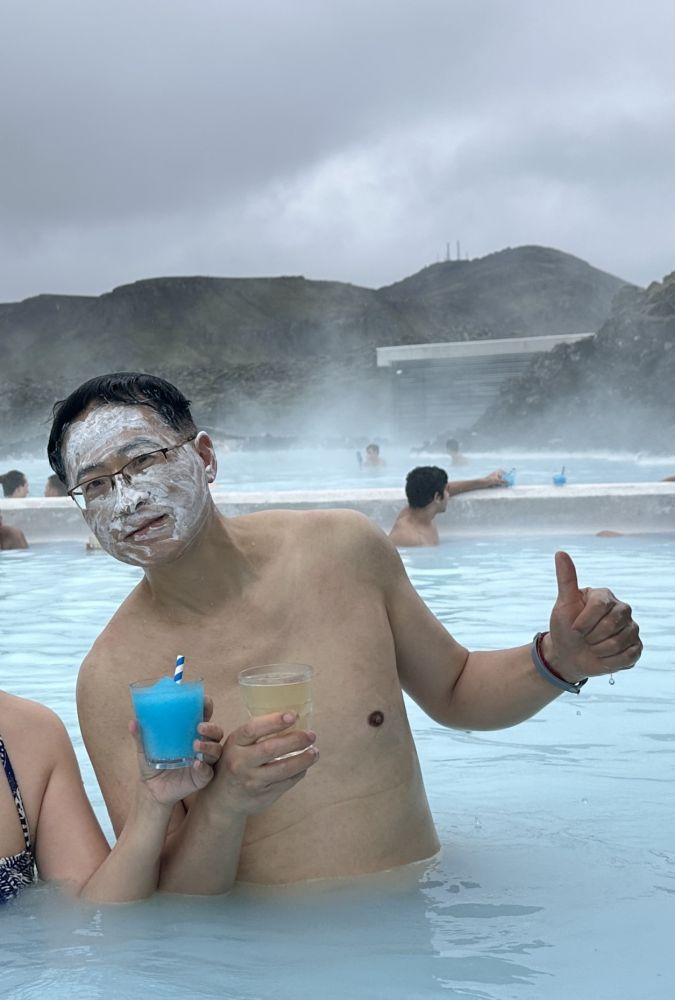 听以前去过????岛的朋友介绍景点,记不住那些坳口的地名,不过蓝湖Blue Lagoon 露天热泉,我一听就记住,多有画面感的美妙之处。看过照片,远山近石之中一大片不透明的乳蓝色水,蒸汽飘扬,似幻似仙!早早地100多美元预定,下飞机后租一辆SUV就去这里,距机场才15分钟车程。停车后,走过一堆上面薄薄一层绿苔藓的黑呼呼奇形怪状的火山熔岩,到泻湖跟前一看,好大一池“蓝色夏维夷”Blue Hawaii 。当年刚来美国在餐馆打工,常听客人点这款鸡尾酒,有rum, cream of coconut, pineapple juice, and Curacao liqueur,味甜,就记住了。不过夏威夷为名的鸡尾酒,不适合比喻冰岛的蓝湖吧。那么应该比喻象什么?当然还是“蓝湖"Blue Lagoon。对,这款同名的也是著名鸡尾酒,有Vodka, lemonade, Curacao liqueur,没有那么甜。尽管现在是六月份夏天,下着凉雨,气温才摄氏六、七度,露天裸身还瑟瑟发抖。跳进38度热腾腾的蓝湖里泡,如果能来一杯凉凉的蓝湖鸡尾酒小啜,肚子里外都是蓝湖,多妙啊,比当年上学时泡的大澡堂感觉高级多了。不过这里居然不卖鸡尾酒,没“蓝湖”,只好点一杯蓝冰碎,有冰有蓝有水,算是与冰岛蓝湖搭上边。温泉水中浑合一种地底下带上来的白泥浆,使水呈浑乳色,把黑色湖岸湖底都漆成白色。白泥据说富含美肤的矿物质。游客们都涂脸上,看着象滑稽可笑的小丑。