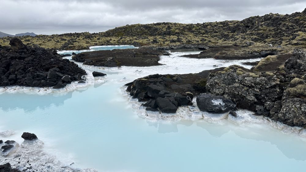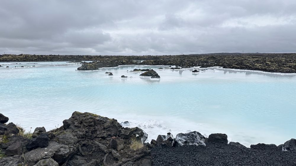 不远处有些工厂似的设施,我一问,是几十年前开始建造的世界第一座地热发电站Svartsengi Power Station。此处地下有股极高温的热泉涌上地表。发电厂用其蒸汽发电,与水混合排出的热水输送给居民取暖。仍然多余的热水,掺入海水冷却后当“废水“排到厂外,形成这个半透明的浅海蓝色泻湖。再整修一下,就成了著名温泉。Oh,my God!原来我们把人工的工业废水池当天然温泉啦?别急,冰岛地热能源纯天然,冰岛的水也天然纯净水,发电能源也是再生无污染的地热。整个过程无污染。“废水”是没一点污染的副产品,更确切地说是"剩水”。尽管有人工加工的过程,但是水质和环境基本上还是无污染的天然温泉,不断进水出水,40小时全湖的水都自动换过,自然清洁。到此,总算又松口气。