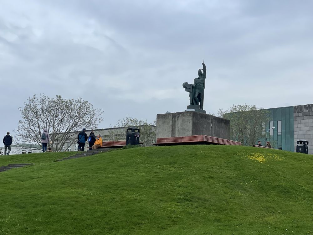 Arnarhóll是雷克雅维克老城一片街心草坪公园,正中这尊像是冰岛的发现者,挪威的维京人酋长阿纳尔松Ingólfr Arnarson。其实他也不是真正发现冰岛的第一人,这是个阴错阳差罪犯变英雄的故事。一千多年前,北欧维京人凭借高超的航海技术和勇武善战,在北欧西欧沿海地区东征西讨,甚至占领不列颠和爱尔兰。一位叫Naddodd的维京人是最早定居苏格兰北面大西洋中的法罗群岛的人。公元825年,当他从挪威去法罗群岛时途遇风暴而偏航迷途。雨过天晴后,发现远处一片陆地怪石峥嵘白雪皑皑。驶近一处海湾,湾里烟雾腾腾,于是他叫这里"雪地"snowland 和"烟湾"。那是在冰岛东端,貌似穷山恶水不宜居,他无心久留,驶回法罗群岛,并说了他的奇遇。公元874年夏天,挪威维京人酋长阿纳尔松因杀人罪被逐出挪威。去哪里呢?当时北欧沿海各地都是维京人地盘,他不打场恶仗难以抢占地盘。他想起Naddodd 传说中的西方神秘岛屿,决心带一帮人去那个无人之地看看,碰碰运气。尽管冰岛东部荒山怪石,他驶往西部,发现有郁郁葱葱的桦树森林和草甸,是很好的定居之处。于是在一处海湾登陆,就是现在首都雷克雅未克之处。这片草地就是他最早建立的农场旧址。这么个好地方,不能让他人来抢。这批维京人回欧洲搬资源时,就说了个吓人的地名“冰岛”Iceland 。不过这诡计不久穿帮,维京人在冰岛的殖民地迅速建立并发展起来。杀人犯阿纳尔松就这样以冰岛的发现者而成英雄,青史留名。再说他这个罪犯才杀过一人,史上有多少杀过成千上万人的魔头,被奉为英雄豪杰国父太祖的?