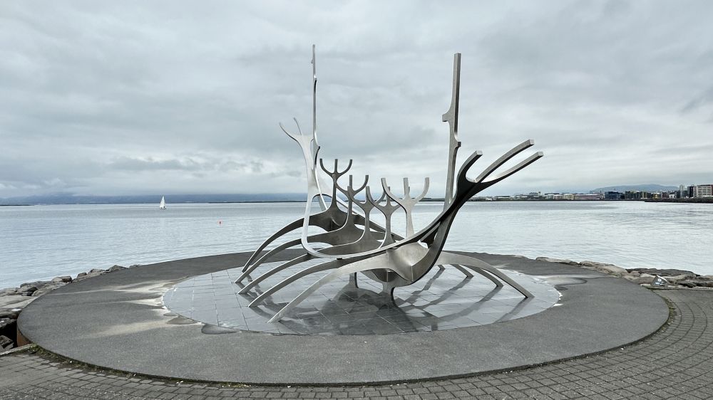 海岸边这座塑像,是不是象一艘维京船中,五位戴牛角头盔的维京战士,正努力划桨?