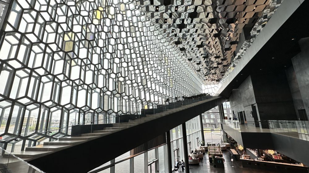 海港边的音乐厅,门厅玻璃幕墙是三维立体的玻璃晶体结构,晶莹剔透又独特。