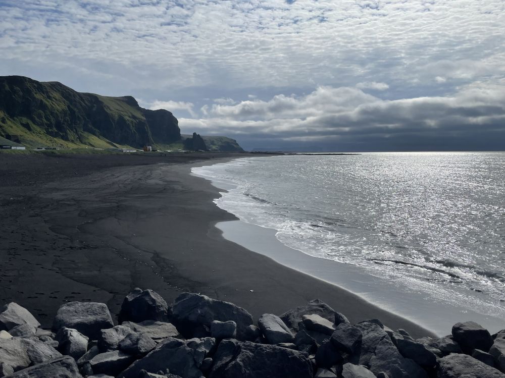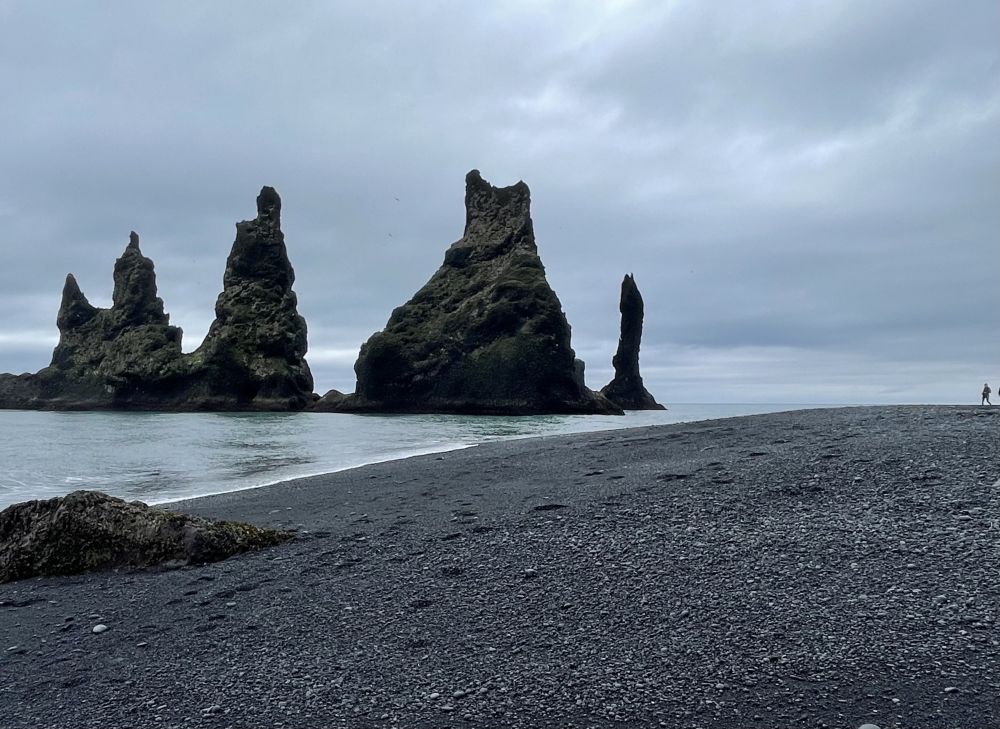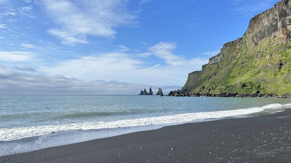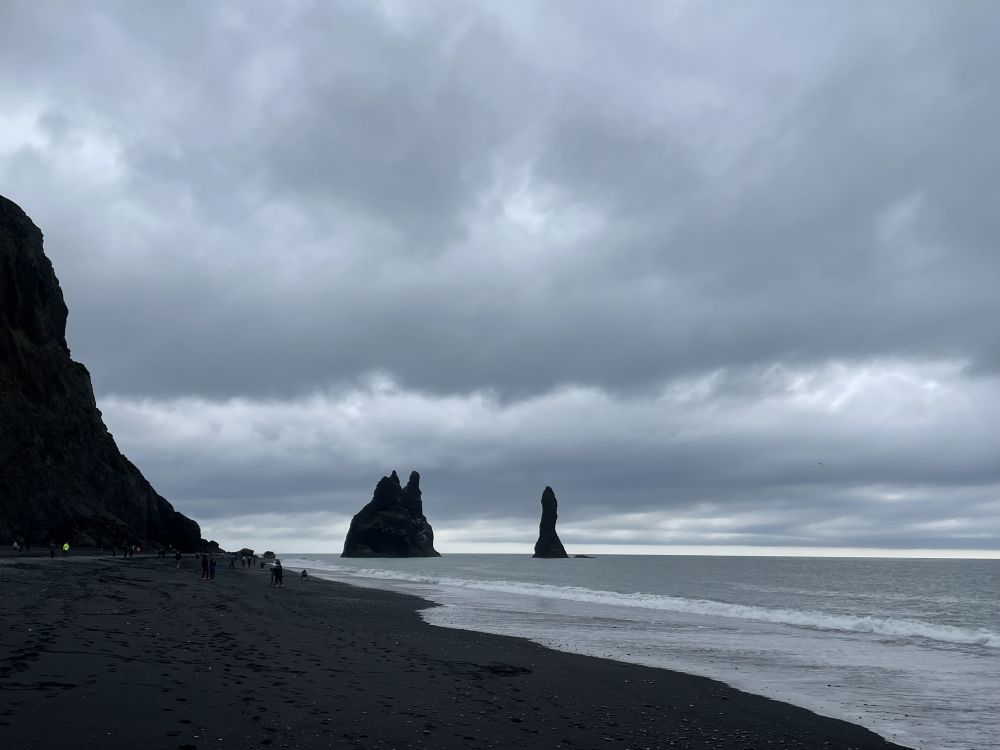 见过不同颜色的海滩,灰沙、棕沙、黄沙、白沙、粉红沙、现在我面前是黑沙。在冰岛最南端的Vik小镇住宿,一早起来去不远处的海边逛逛,就是绵长几公里的细软黑沙滩。早上天上灰云间尚露出些许蓝天白云,让海水山崖抹上淡彩。远远有一队游客骑马缓缓走过沙滩,但沙滩几乎无人,听人说几公里外山那边Reynisfjara,有个更有名的黑沙滩。那咱们也去那里看看。