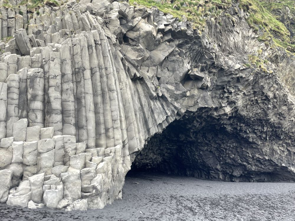 冰岛的火山流出的炽热熔岩浆,在压力下,下层慢慢冷却凝结成六棱柱形。千百年来风蚀雨侵,黑色熔岩上层的的碎石散土落海又冲上岸,就形成罕见的黑沙滩。夏威夷大岛也是火山形成,岩浆凝结成的黑石经年累月后,也有类似的黑沙滩。仍然?立在悬崖边上的这些六棱形石柱群,形成整齐的石墙,旁边甚至形成拱形石窟,窟顶密密排列六角形石柱断面,相当神奇魔幻。这个结构不象纯天然构成,倒象人工浇铸的巨大混凝土环境艺术品。游客们每人都以其做自拍照片背景。