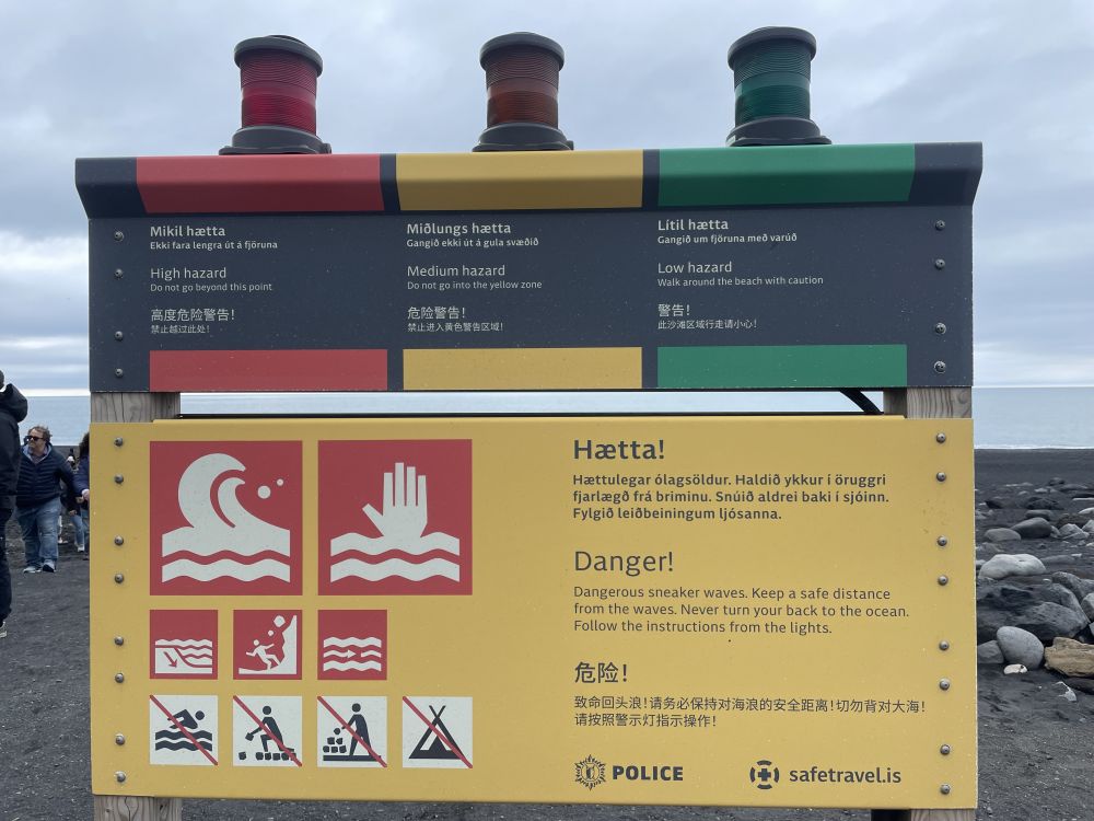 另外一块告示牌警告:因为面对大洋常有怪浪,游客不要靠水边太近以免危险。牌子上方有绿黄绿三色灯,标示游客在海滩上可以活动的范围。冰岛旅游点的介绍,一般有冰岛、英、法、德文四种。奇怪的是这块告示板文字不是通常上述四种文字,而是冰岛、英、中文三种。难道法德人不需要注意,而中国人要特别注意?今天亮黄灯,照理不能走到沙滩水边,但还是有些人走到海浪边几米之距,估计他们是美国佬和中国客。我认得英文、中文,读了两套警告.可我还是没遵守,仍然走近水边。黑沙滩不常见,规则嘛,咱是老中的基因,嘿嘿嘿。