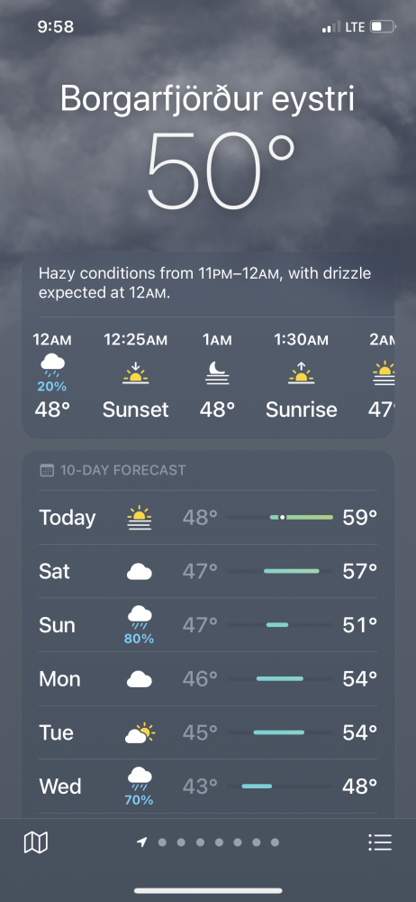 6月22日是夏至,白天最长的一天。6月23日,白天也很长。有多长?晚上在冰岛东北角渔村Borgarfjorour eystir看天气app,显示当天日落时分是半夜13:25, 明天日出时分是凌晨1:30,即白天日出日落时间近23小时,另外中间相隔一小时零五分钟,天尚未黑下去又重新亮起来,百分百的白夜。