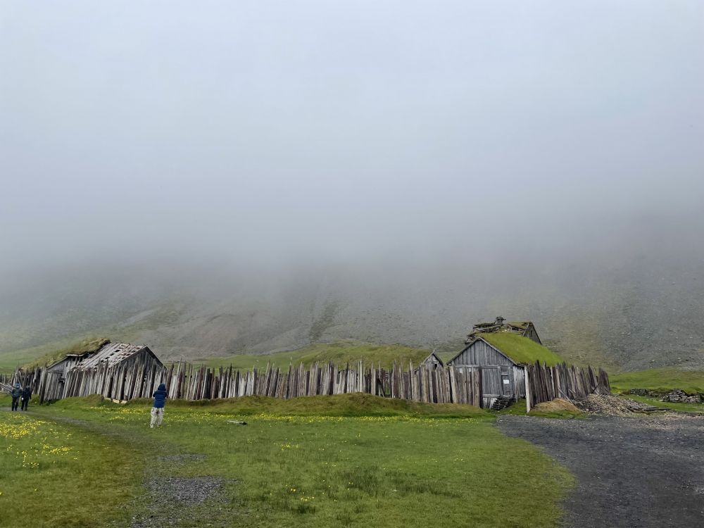 早晨在Hofn加油后,先去看维京人村,在一个私人农场里,一座据介绍非常漂亮的山崖和海滩之间。可惜浓重云雾,只见海边山脚看不远。冒着小雨,沿着海边黑滩涂走过去,破墙旧房,村中还有几块巨大的鲸鱼龙骨,好像很古老。其实是十几年搭的电影布景,因故未拍,但倒也建的像模像样,村外还有艘维京船。回来刚上车,车外开妨下大雨,总算还有点小运气。