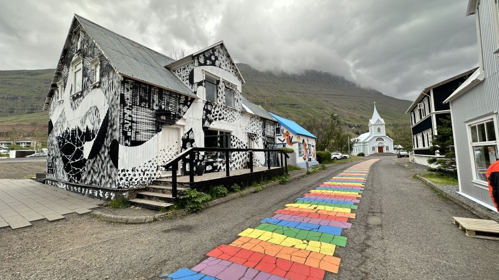 为专门访这个瀑布,多花了五个小时。途中拐去著名的小渔村Seyoisfjorour 。远远看见一艘维京人大邮轮停在码头边,看来此地是热门旅游景点。村中一条彩虹石路,通向小教堂,是明信片的景象。才下午五、六点多钟,想去的鱼巿场已经关门。我们草草在网红打卡点留影,上车继续赶路。