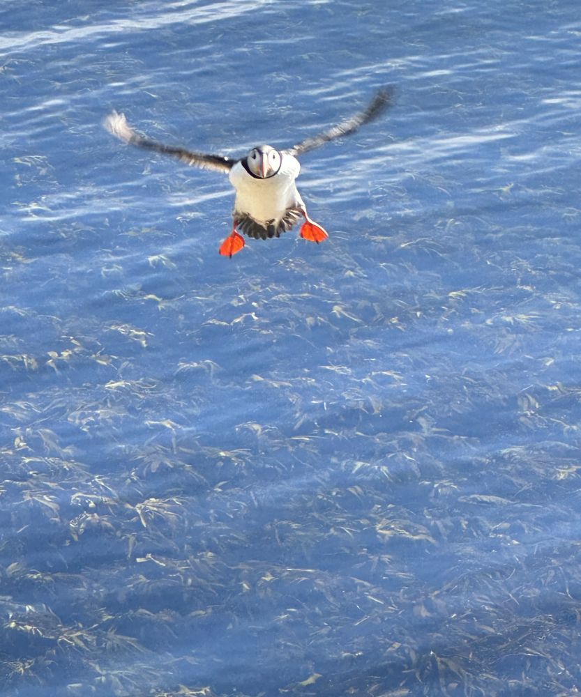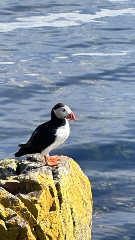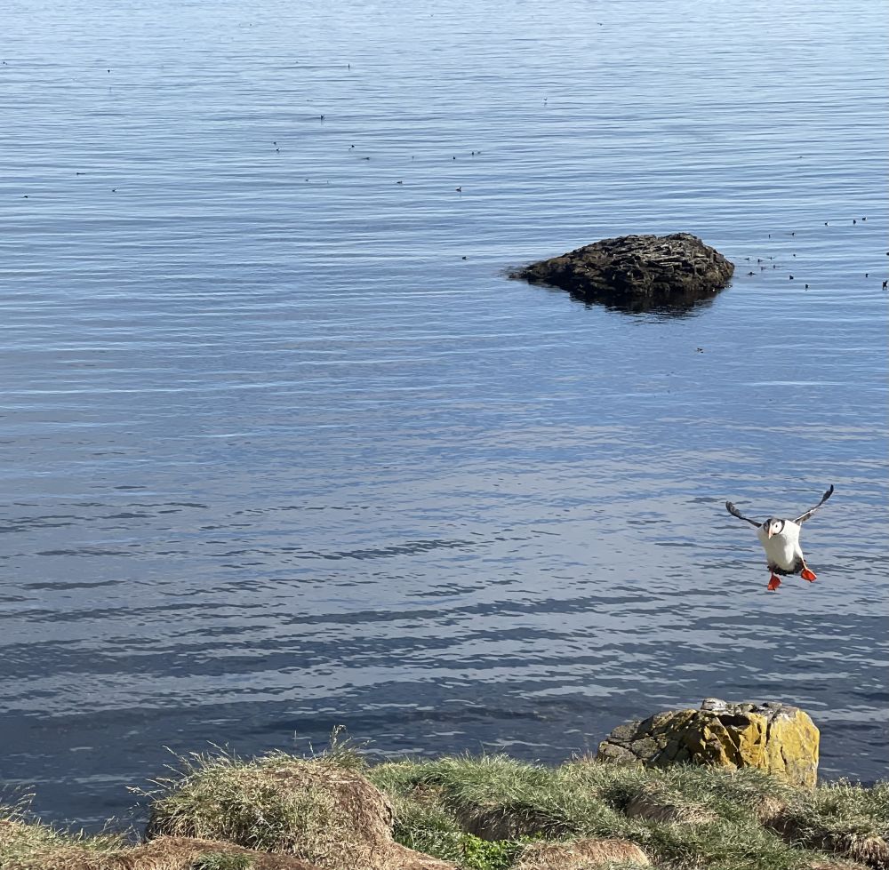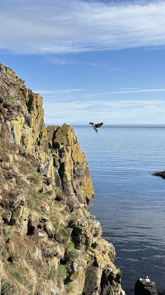 太累太晚未来得及当天完成这篇,补充一段。果然“明天”更好。一大早阳光灿烂,去看冰岛国鸟海鹦puffin 。村旁一座小岛号称海鹦之都,每天四到八月,成百上千的海鹦飞到此岛打洞筑巢繁殖。开车6分钟就到,果然名不虚传。海鹦就在步道边不到一米远,用手机拍特写毫无问题。接下来让照片说故事吧。