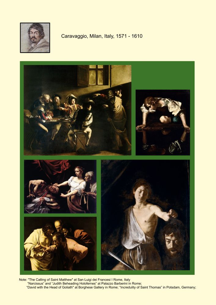 作品: 罗马的法国圣路易教堂的《圣马太召唤》;罗马的巴伯尼宫的《朱蒂丝斩首何洛非尼》和《纳西斯》;罗马的博盖塞美术馆的《大卫拿着歌利亚的头》;德国波茨坦的 Sanssouci 的《圣托马斯的疑惑》。