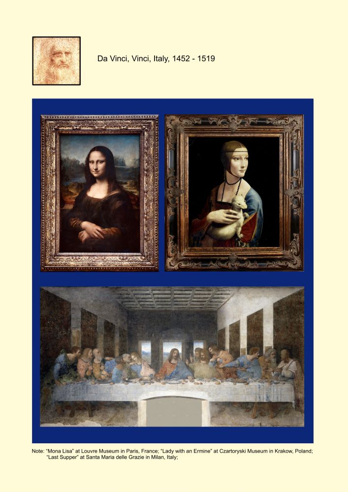 作品:法国巴黎的卢浮宫的《蒙娜丽莎》;《洛克圣母》和《圣约翰洗者》;意大利米兰的圣玛丽亚德拉格拉齐耶教堂的《最后的晚餐》;佛罗伦萨的乌菲兹美术馆的《报喜天使》;波兰克拉科夫的查尔托里斯基博物馆的《抱银貂的女人》;意大利都灵的皇家图书馆的《自画像》。