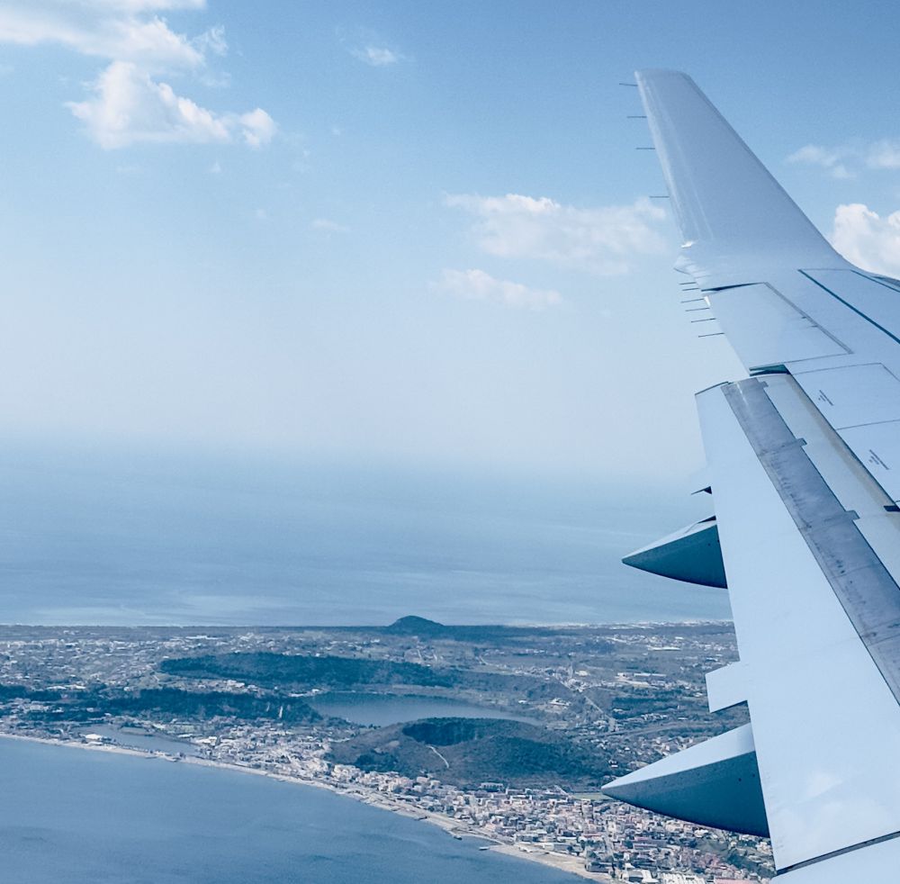 飞机降落那不勒斯前,右舷窗外现出海岸。那里是那不勒斯城西面的一个巨型火山口盆地区Campi Flegrei,有许多死火山口、地热活动、古罗马遗址。索尔法塔拉火山口Solfatara crater有最典型的地热景观。地面不断喷出硫磺蒸汽,地表温度很高,是罗马神话中冥界入口之一。