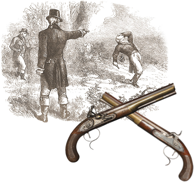 汉密尔顿和伯尔两个人在各种问题上的对抗一直持续到1804年。最终伯尔向汉密尔顿挑战决斗,汉密尔顿受致命枪伤而亡。决斗用的手枪由汉密尔顿的姐夫约翰·丘奇(John Church)拥有,丘奇的孙女在1930年将这两把手枪卖给了曼哈顿公司银行。曼哈顿公司的自来水公司铺用空心原木制成的管道网络向纽约供水直到1842年结束运行,而曼哈顿公司银行则继续发展成为当时美国领先的银行机构之一。(照片来自网络,是汉密尔顿和伯尔决斗时用枪)