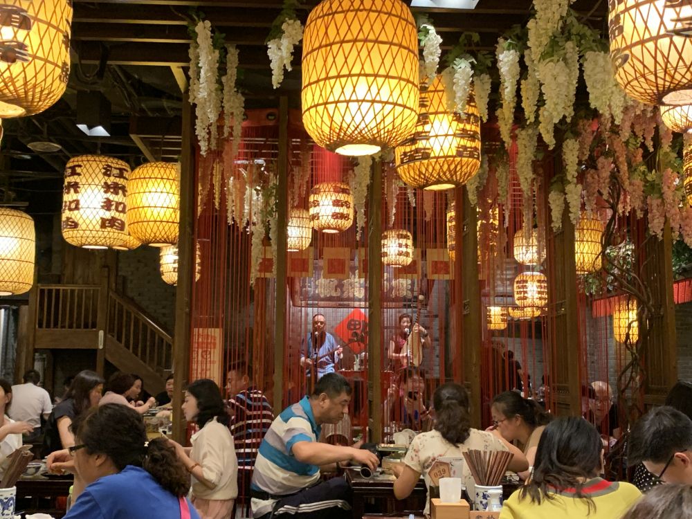 南京大牌档始创于1994年,是南京人展示独特金陵菜系的古典饭店品牌, 现在在全国各地都有分店。今年五月去南京,去了夫子庙附近的一家,人气很旺,环境布置与秦淮河两岸的古建筑风格相映,店里还有传统评弹表演。 店门上方挂着“大牌档”字样的横匾,两侧挂着大大的灯笼,店内摆着八仙桌,屋顶上吊着许多灯笼,服务员都穿着复古的衣服,很有意思。