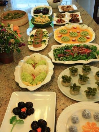 好了,上菜了!本次聚会的主题是健康养生素食。第一个惊艳亮相的是老叶子的金色池塘,构思巧妙,色彩搭配艳丽。豆瓣泥压制而成的莲蓬,洋葱刻成的莲花,南瓜汁沟芡而成的池塘,精美绝伦。菜端上来之后很久都没有人忍心下筷。
