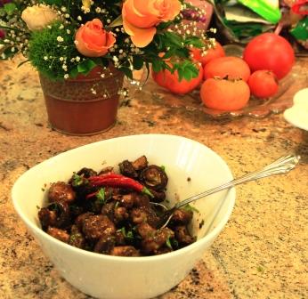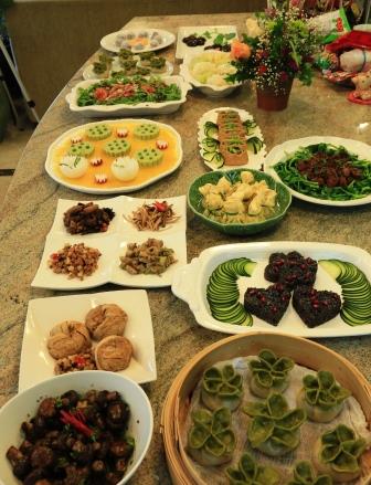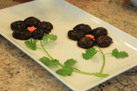 最后压轴的是我们大厨的九转素肥肠和卤香菇。九转素肥肠颜色和形状酷似真的肥肠, 可以以假乱真。菜色红润,香、甜、酸、辣、咸五味俱全, 烹调得十分的入味。大厨的又一个杰作!