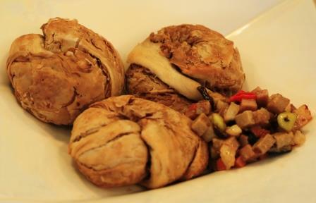 接下来是老叶子的八宝钱袋,钱袋是老叶子用极其繁琐复杂的工序加工百叶制成的豆腐皮做的。八宝钱袋口感滋润滑顺,里面装有八样蔬菜包括蘑菇,木耳,栗子,等等。清香鲜美!寓意吉祥!在此祝各位看官新年鸿运昌顺钱袋鼓鼓的!