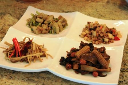 (从左下角起顺时针方向分别为:Ross的干锅三丝,美食宝典的莲藕小炒,牡丹燕菜的炒三丁,和明姐的素什锦)