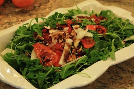 牡丹燕菜还带来了蔬果沙拉,用芝麻菜(arugula), 柿子薄片,梨,和烤制的坚果拌匀而成。沙拉酱是牡丹燕菜家的密方,堪称一绝,在此暂时保密!沙拉色泽青翠油亮,口感清脆爽口,夹留香甜。味道绝对是不一样滴!
