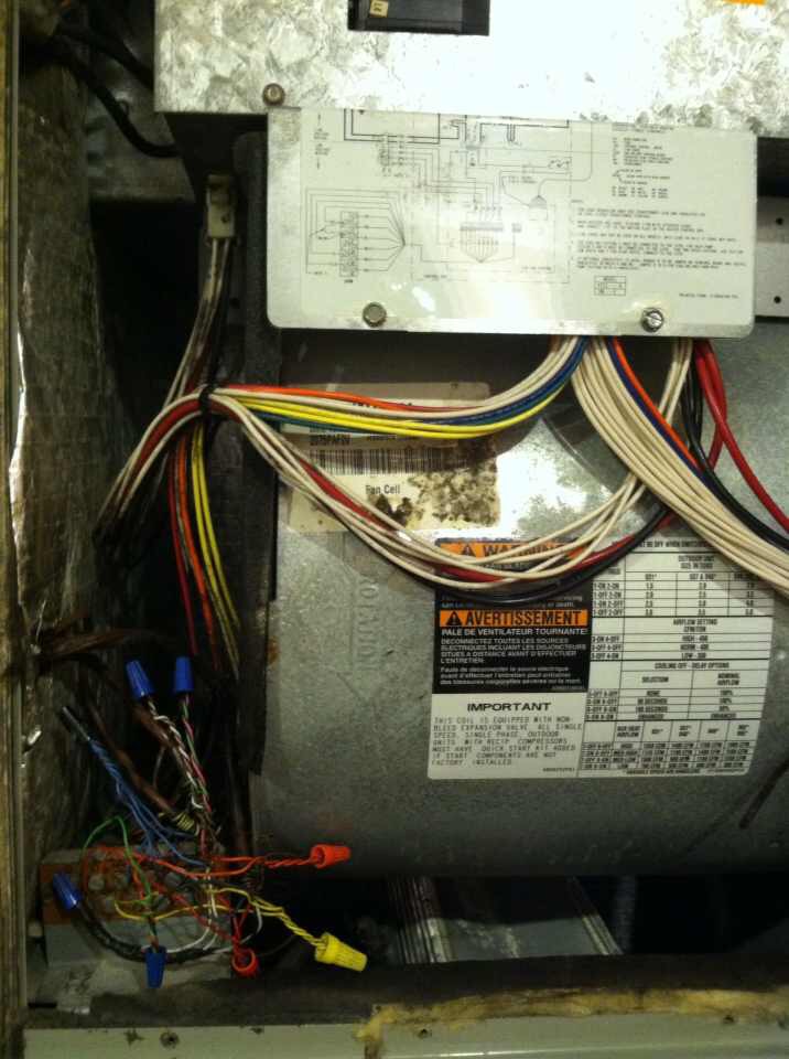 回来先查第一薄弱环节 – 低压控制线路的保险丝。 关掉总配电盘上的暖通空调开关。打开Furnace前挡板, 即可看到低压线路控制盒,盒前盖上印有控制线路图。