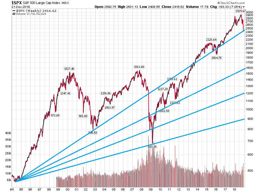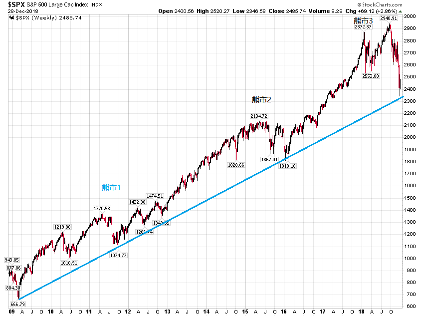 图上显示趋势线和三根支撑线,对应的下跌目标位为2400,1600,1200,和900。第一根线也可以看作长期的趋势线,目前刚回归到趋势线,08年趋势线被突破后曾暴跌。如果从2009年开始的牛市真的像过去有人说的那样是一轮17年的大牛市周期的话,那今年的下跌与2011和2015一样只是在这大周期中的小熊市,现在价位就可能基本到底,横盘到三月初如果中美关系缓和,像2016年初一样开[
