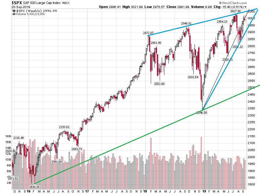 单纯从TA讲,向上和向下突破都有可能。但从经济和价值角度看向上突破应该是假突破,而向下突破才是可持续的趋势。目前SPX已接近年初按TA预计的牛市目标3100,上升空间已不大,一旦向下突破年底可跌到支撑2500附近,12月应跟去年一样是个底部。