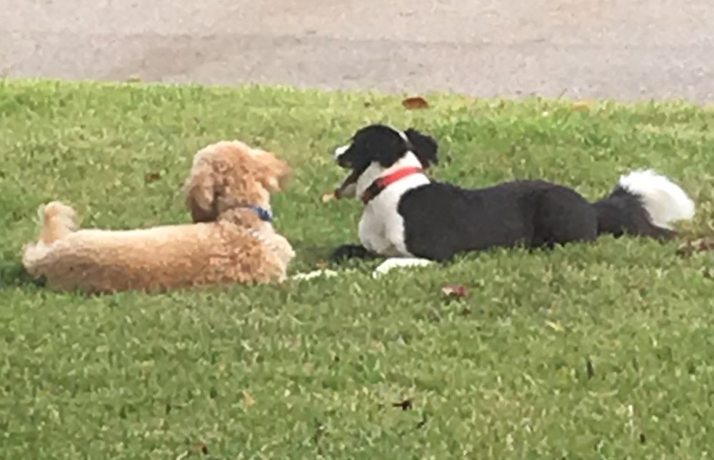 今天爸爸下班后带我去狗公园了。公园挺大。分为大狗区和小狗区。每个区都有两道铁门。在公园,所有的狗都不用栓链子,全都可以自由活动。