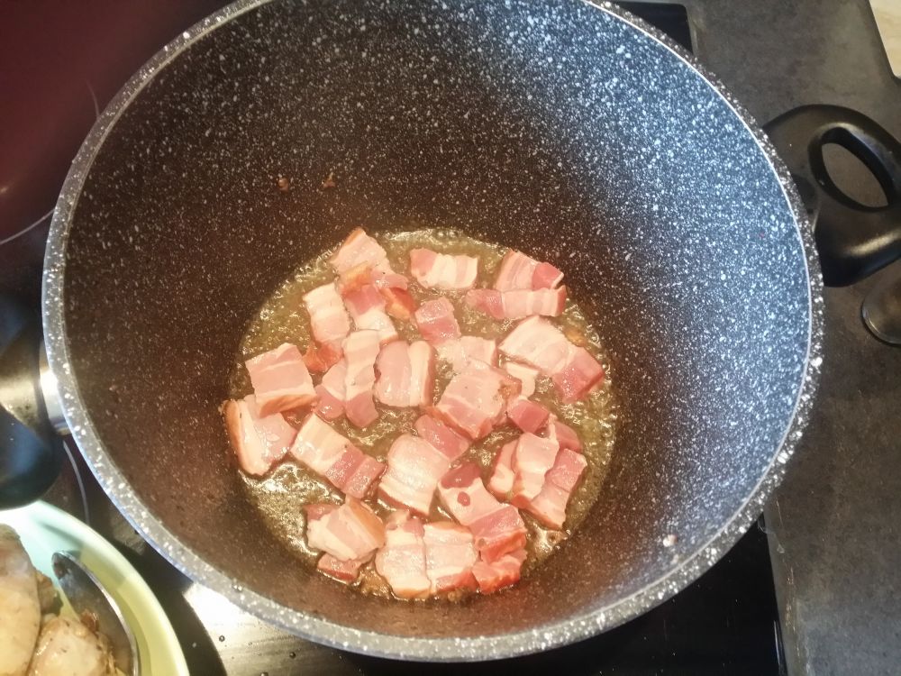 1,将锅放油烧热,放入培根丁,翻炒均匀,然后放入洋葱丁,炒制变色。