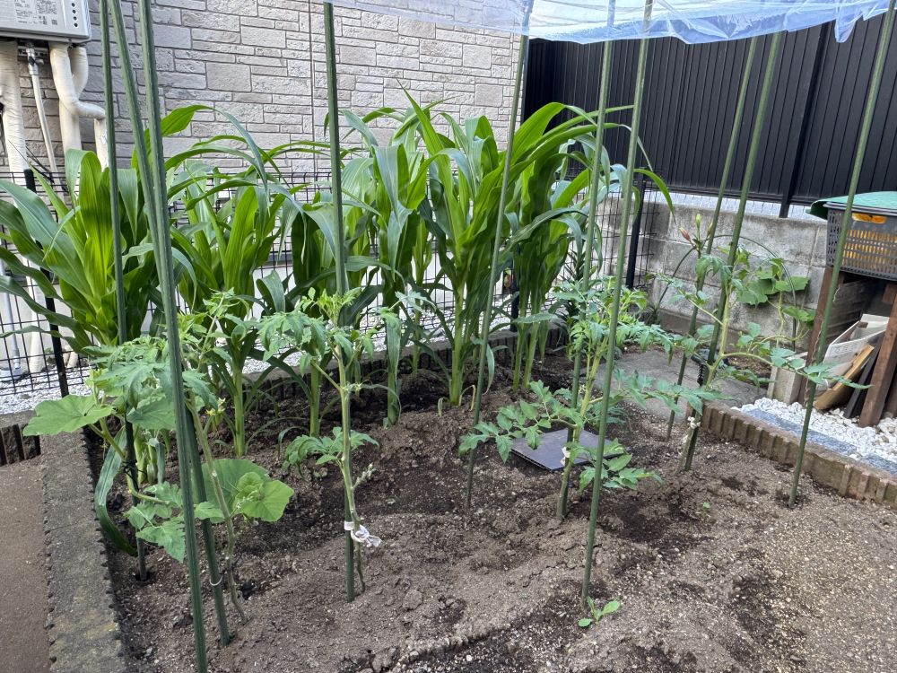 玉米是黏玉米,西红柿也是老家的品种。这次用了新的方法打杈,就是在果实还未成熟时,打去最下面的叶子。因为院子太小,通风不好。刚开始开花。还有好几根自己窜出来的南瓜秧子,给了邻居家很多,扔掉很多,邻居都说我家院子,虽然是种农作物,但是看着真漂亮。希望的小小菜园子能再获丰收。
