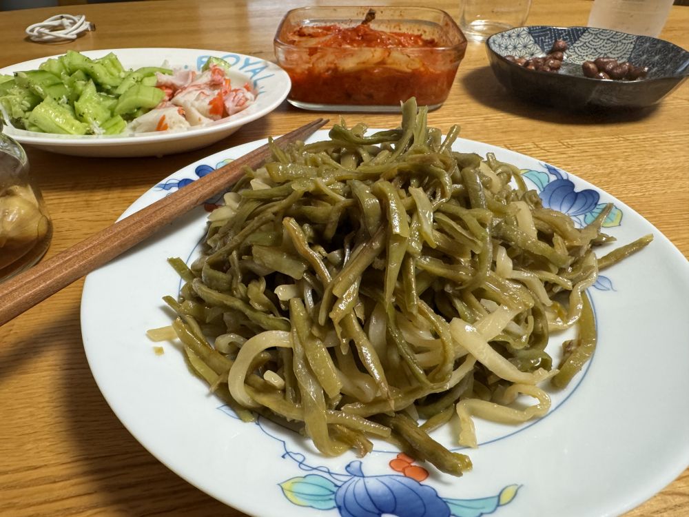 我在家里做饭等。昨天气温太高了,我说你别去地里了,先把剩下的几个包子吃了吧,然后顺手又把两个粽子叶热了一下。领导吃啊吃啊,说你晚上别做饭了,我都吃饱了。但是我没吃呀,凭啥不做饭啊。继续按原计划做了豆角丝焖面。豆角丝就是我从国内带回来的,无可替代的好吃。下班回家时直接去商场了买了面条。豆角丝很嫩,稍稍放点水就可以很熟软的。调味料只用了花椒大料和一点点酱油,这个面条是和赶出来的一样的那种生面,直接放在豆角丝上面,盖上盖子,小火直到汤汁只有一个锅底那么点的时候,再翻拌面条和豆角丝,等锅里的汤汁都干了,面条也入味了,就可以开吃了。我自己一个人慢慢的吃,最后剩下一点吃不下了,今天早上偷点领导昨天没吃的那盘子里的,太满足了。吃的时候放点腊八醋,好吃到就是觉得自己肚子咋这么小。