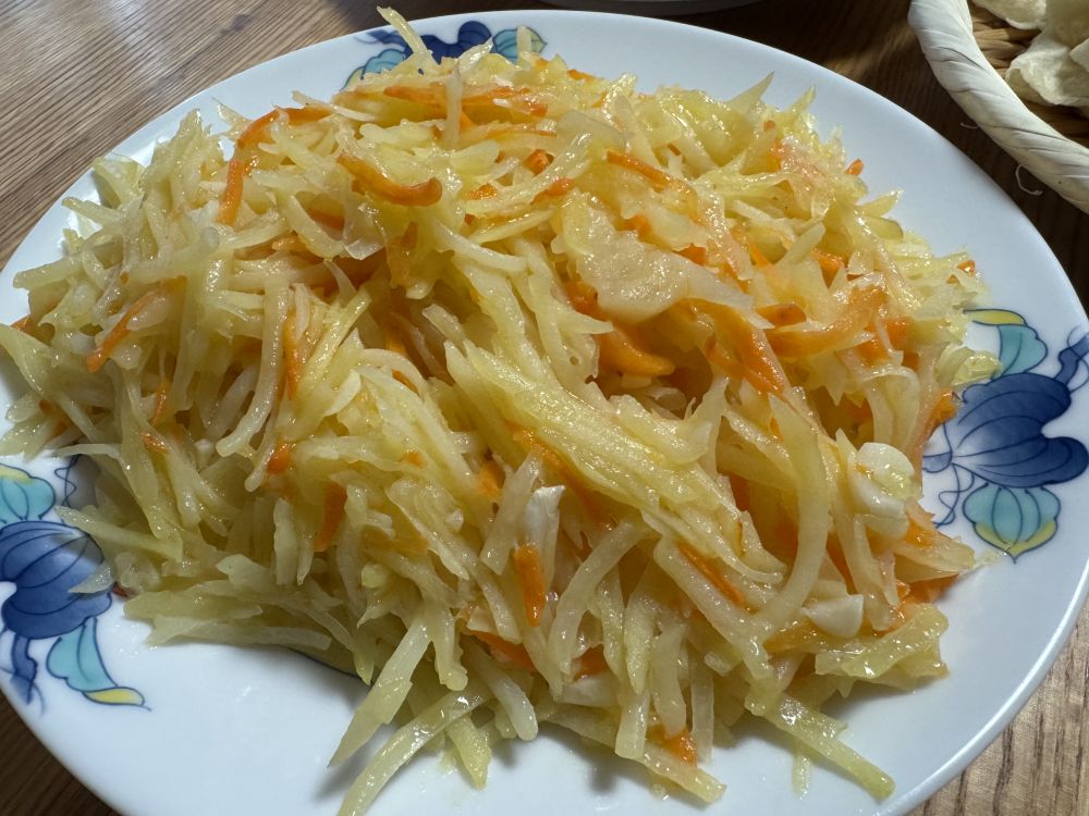 下班回家没那么多时间切功夫土豆丝,就用插板插丝了,冷锅冷油,把切好的土豆丝胡萝卜丝一起放进去,小火炒到变色,放盐醋花椒油蒜末,出锅香喷喷的,还没有油烟。一边烙饼一边炒菜,时间搭配刚刚好的。
