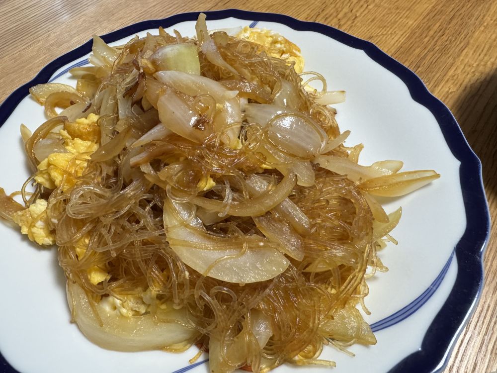 还炒了一盘子洋葱鸡蛋粉丝,洋葱也自家产的,最近日本的鸡蛋价格也是坐飞机的上升了。