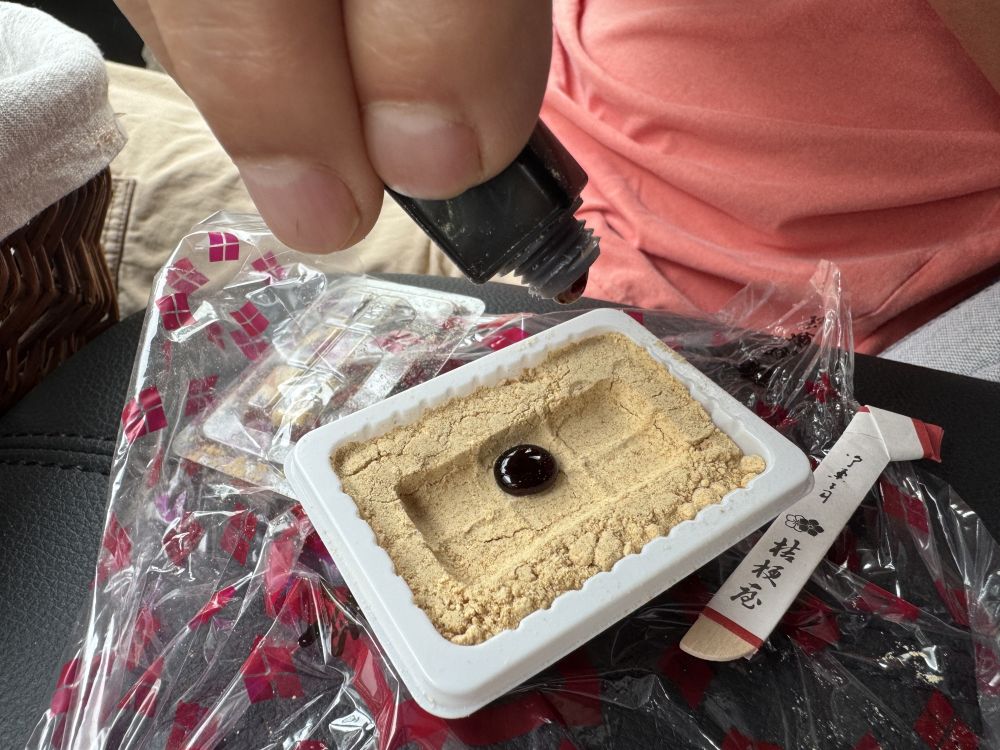 把糖浆倒进去,黑糖浆就是红糖熬制的吧,这个点心真的是最甜的了,没有之一。豆粉是甜的,里面的年糕也是甜的,甜甜甜。拌一拌就可以吃了。这么甜的东西,吃下去很有满足感,也是很日本味儿的点心。而且这个点心工厂就在山梨的,可以去参观和购买其他的产品。有兴趣的可以看我的视频。