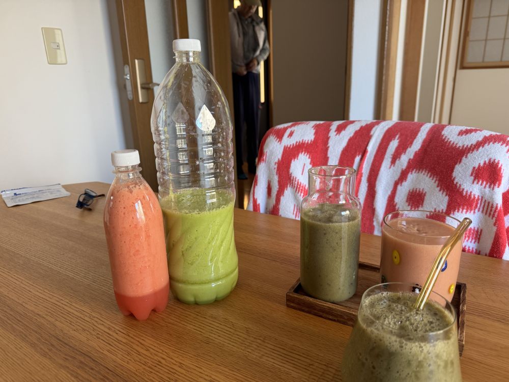 周末的两天,很快就过去了,一个夏天有很多的农活要干。也有太多的好吃的等待打理和收获。昨天晚上准备这些蔬果汁用的东西,到很晚才完成。今天早上打了3种蔬果汁。瓶子里的是给老8带来公司的,红色的是基础+西瓜西红柿和桃子的,有8种食材,绿色的是基础+生菜和黄瓜的;杯子里的是早上现喝的:基础4种+黑葡萄,猕猴桃,薄荷叶,生菜等,颜色就乱套了。今天的蔬果汁一共可以摄取到12种食材。