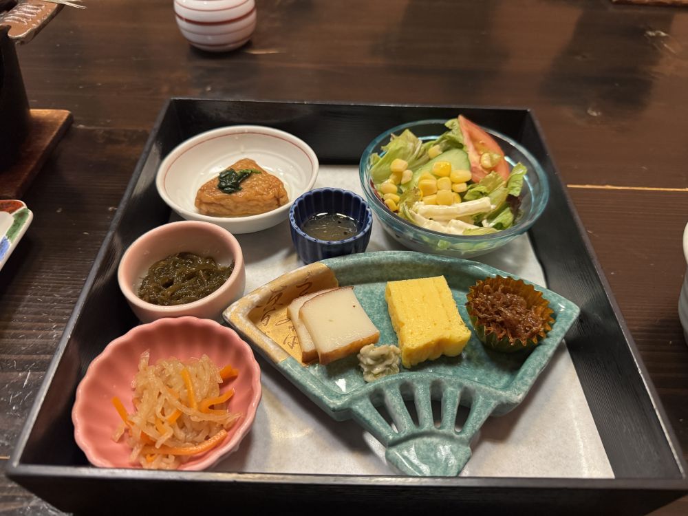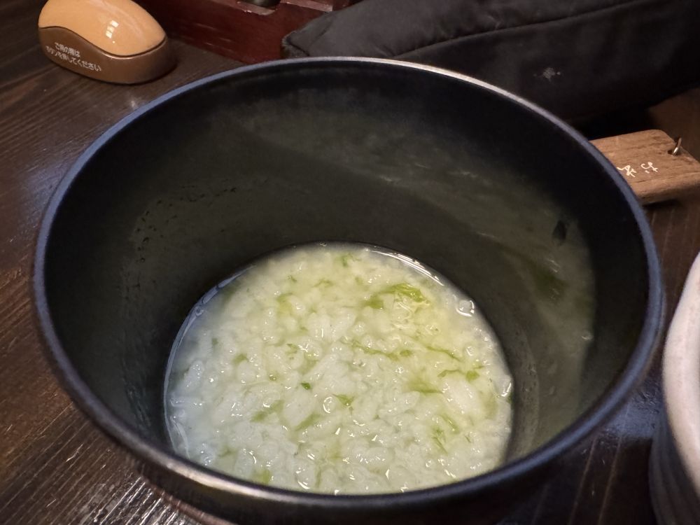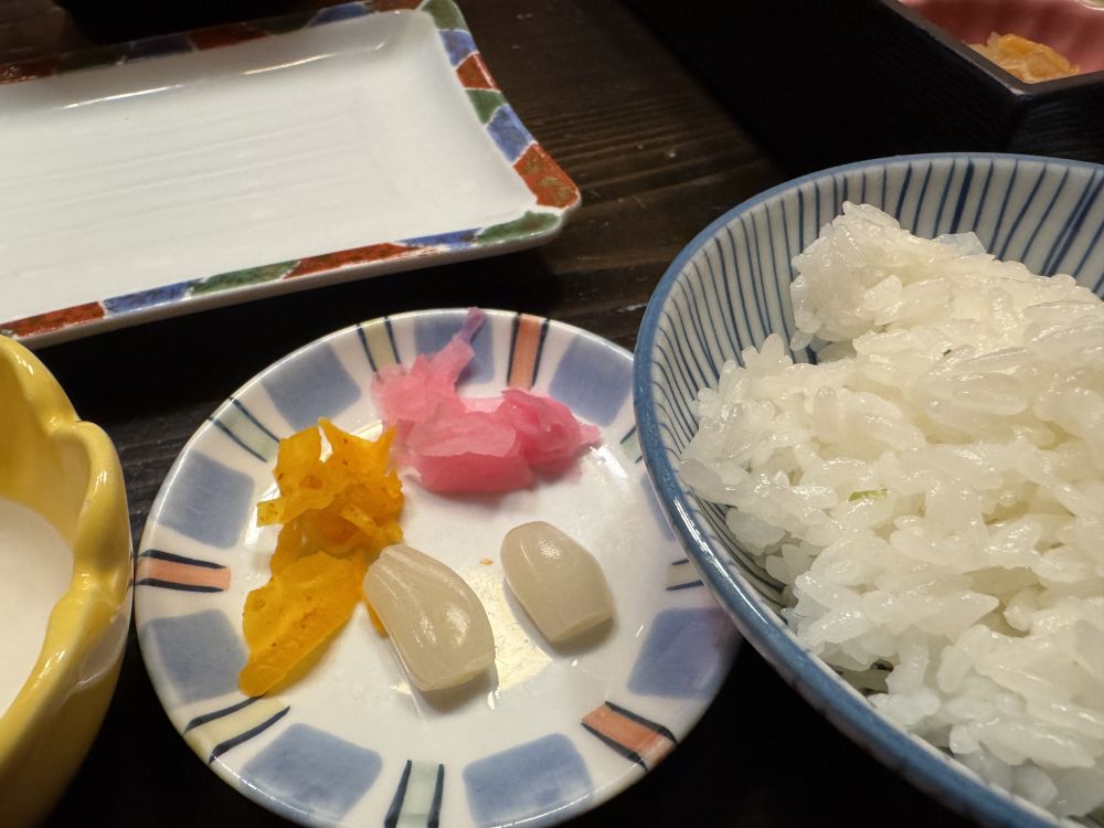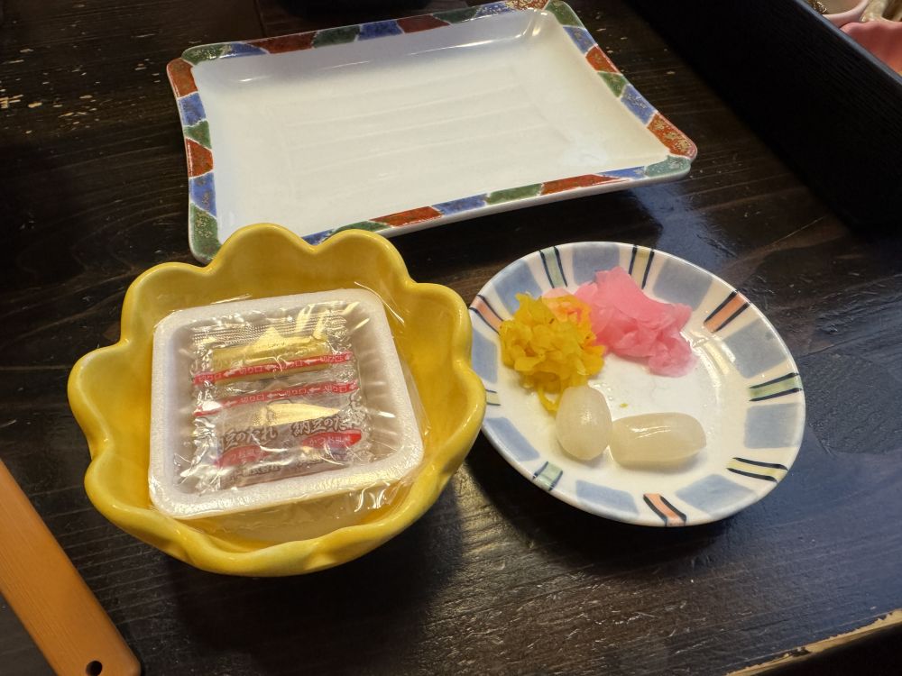 纳豆放在饭上吃,小咸菜放在上面那碗粥里。