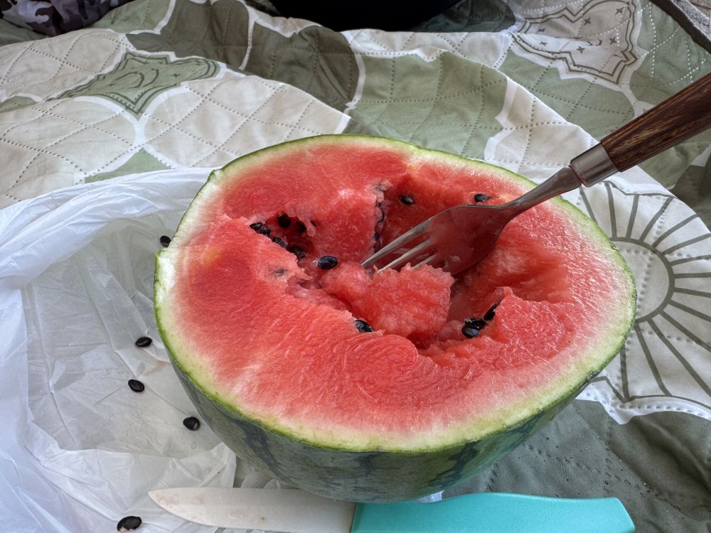 这一次先去海边旁边的商场买了一个小西瓜,一分两半,挖着吃,然后拍照片给我姐发过去,去姐说,小时候这样吃西瓜是是多么的奢侈啊!