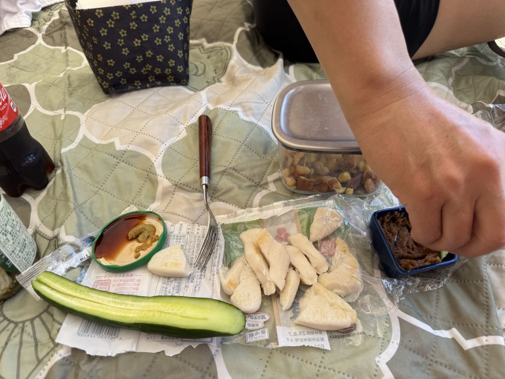 刚到海滩的时候,先把早餐吃了。早上出来,在黄瓜秧子上摘下两根黄瓜,东北的黄瓜蘸酱不能少。