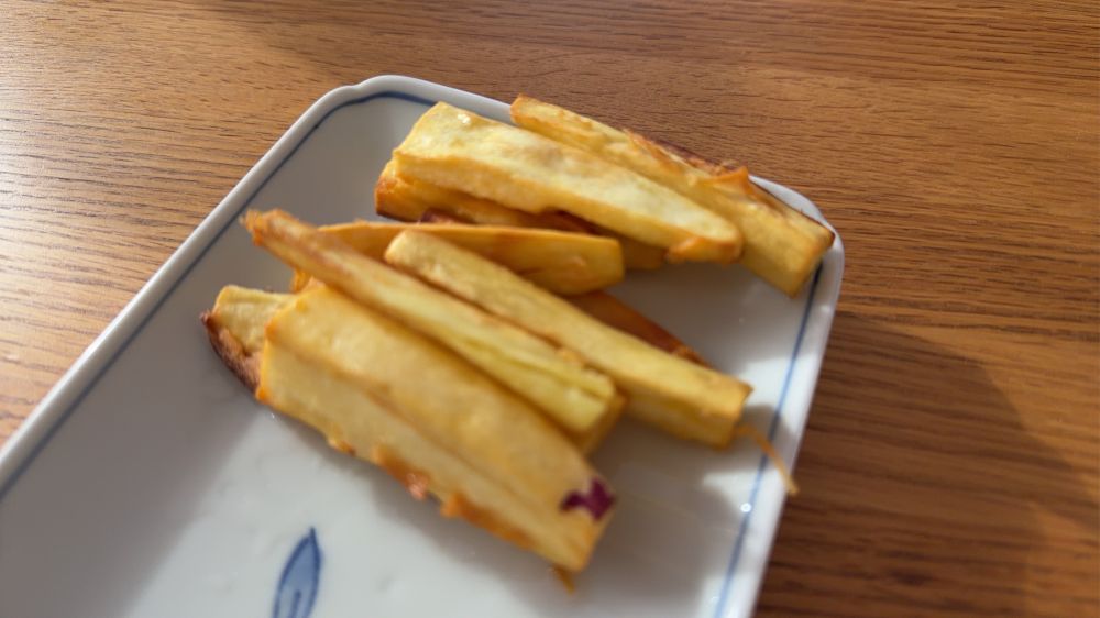 挖完地瓜回家,好开心呀,地主太太说自己种了十几年的地瓜,第一次这么大丰收。其起出的地瓜,需要放置一周以后再吃会更甘甜,但是我想吃吃这个新出土的地瓜,就拿了一个小一点的,切成条炸了一下,哎呀实在是太好吃了。
