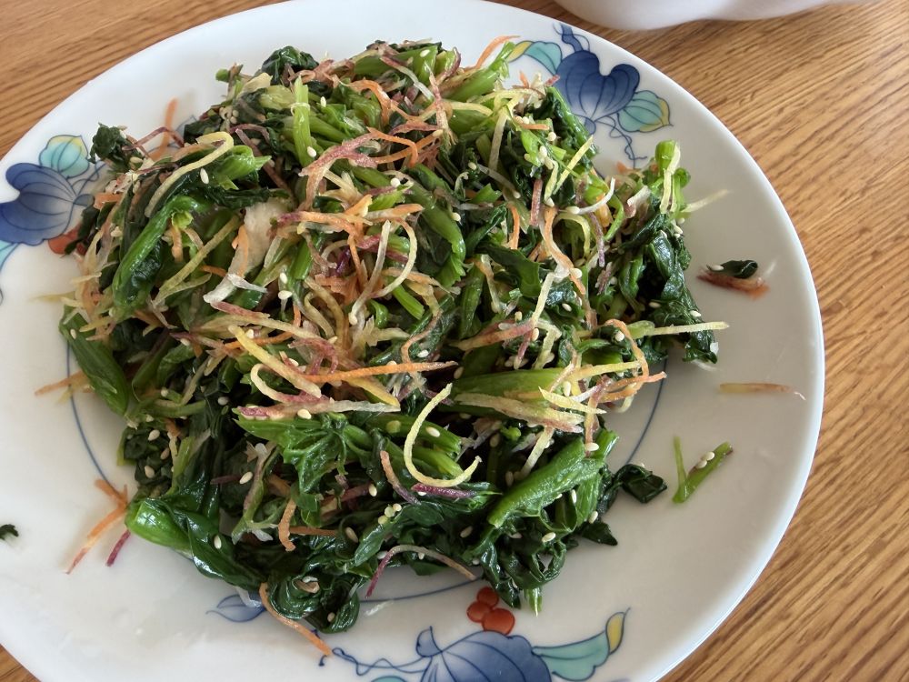 领导从大地里摘回一些菠菜,都焯水过冷水,用芝麻和盐拌一拌。
