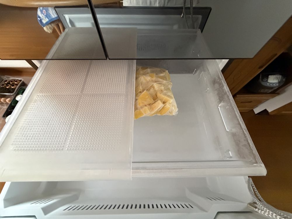 这个冷冻室的下层,有时会放点海鲜和鱼类。现在只有一点去年剩下的粽子叶和马莲绳。有时在国内旅游,会带上几瓶冷冻的蔬果汁,冷冻的蔬果汁,从解冻开始到实用,可以冷藏保存3天。这样在家附近旅游时基本不用带破壁机了的。
