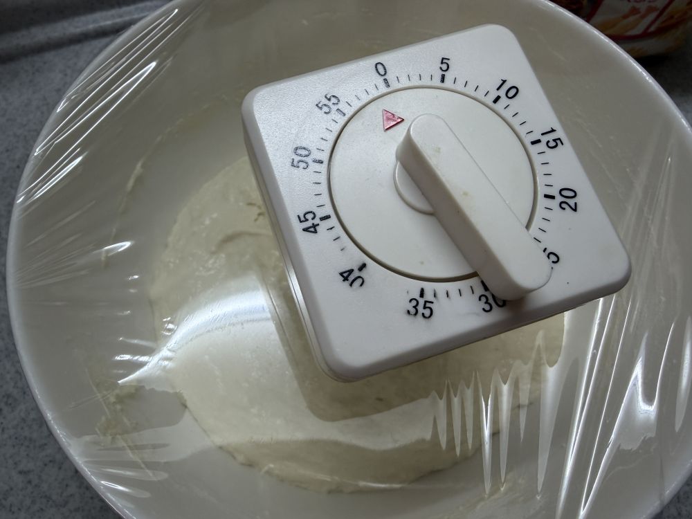 定时在1小时,不用完全发酵。这期间准备其他材料。我是发酵了30分钟开始整形的。