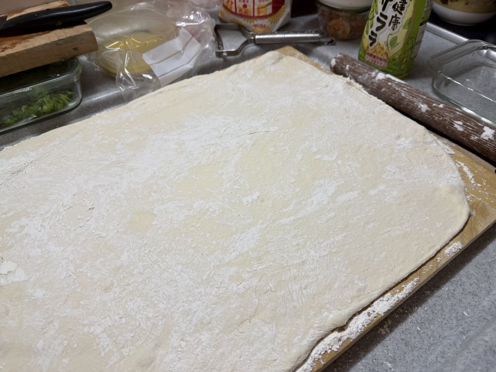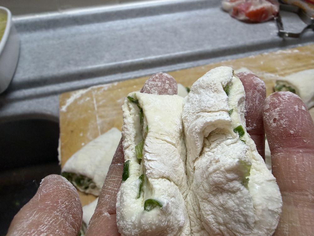 摊开,卷起来,卷的紧一点好成型。