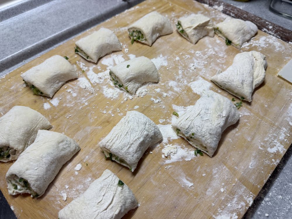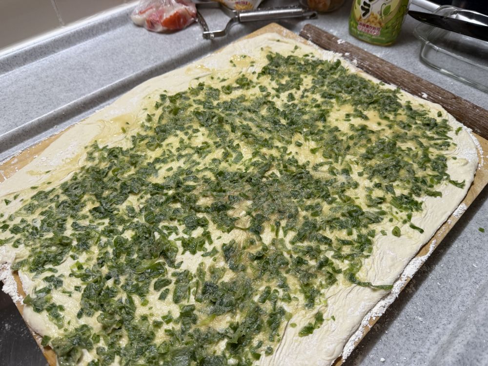 如果是切成段的再醒发1分钟,外面刷上蜂蜜水,撒上芝麻,放入烤箱230烤15-20分钟,就是上海葱花烤饼。