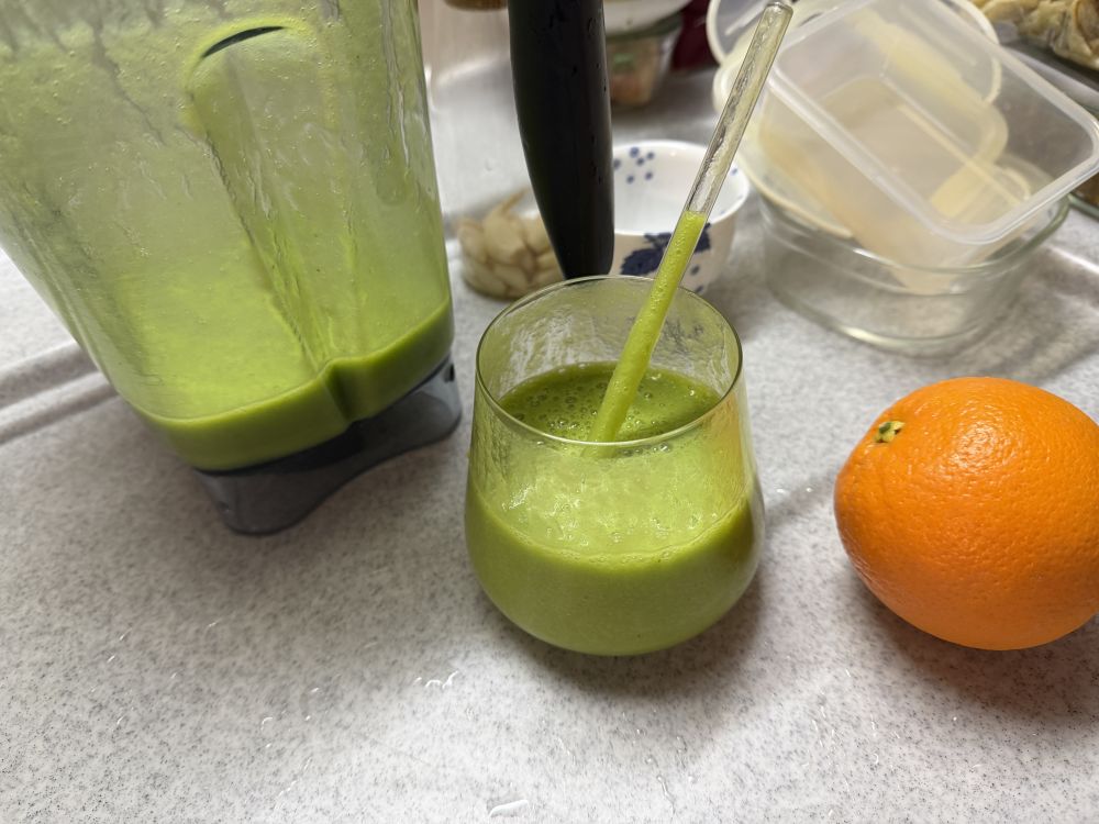 早上依然是绿绿的蔬果汁,春天可以吃到很多绿色的蔬菜。里面放了羽衣甘蓝的。都是早上直接从院子拔的。